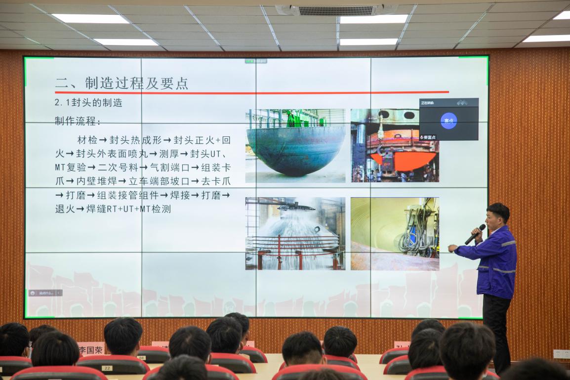 2011级校友-孙靖东,现为青岛兰石重型机械设备有限公司焊工高级技师,兰石集团焊接操作师,国家级技能大师工作室焊接负责人。多次荣获“甘肃省技术标兵”、“甘肃省青年技术能手”、“甘肃省技术能手”“青岛市劳动模范”、“西海岸新区工匠”、“西海岸金凤凰工匠”等荣誉称号。他带来“工业互联网下石油化工大型压力容器概述”的报告,报告从个人成长谈起,从所从事的焊接工作为例,详细介绍了加氢反应器、制造过程及要点、内件安装及要点、注意事项制造问题等精彩内容。