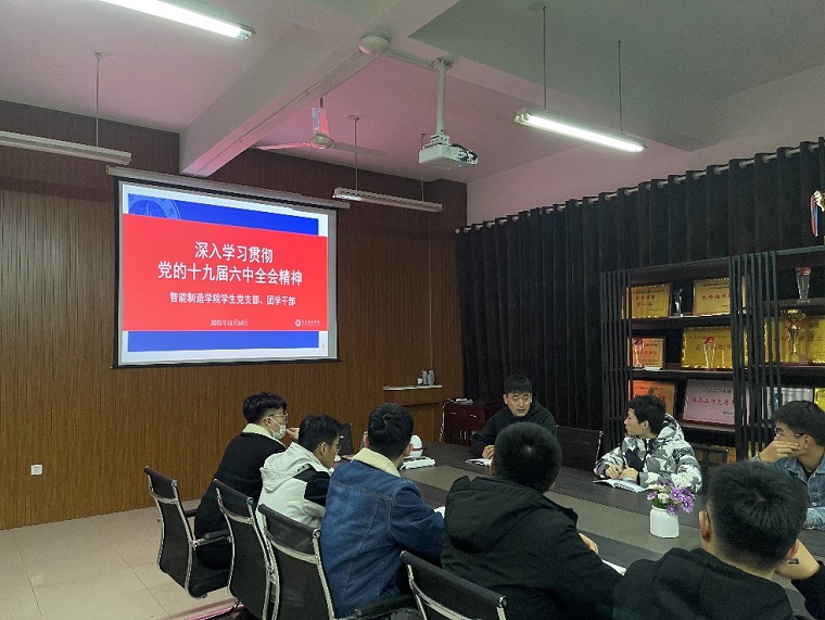 11月8日至11日,中国共产党第十九届中央委员会第六次全体会议在北京召开。为严格落实“三会一课”,推进“两学一做”制度的实施,让团学干部更加深入透彻地理解全会精神,11月14日晚,智能制造学院党总支学生党支部组织学生党员、团学干部在301会议室集中学习党的十九届六中全会重要讲话精神,学生党支部书记刘树龙出席并主持会议。