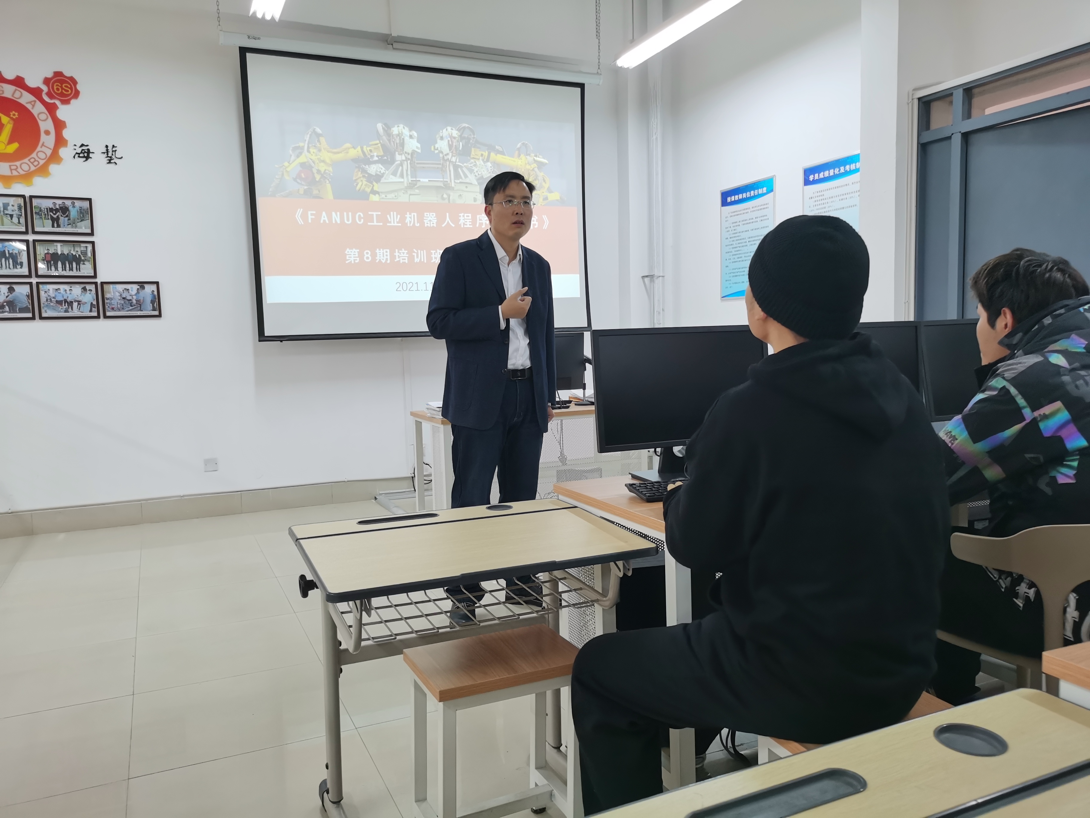 2021年11月18日下午,青岛工业机器人公共服务平台发那科机器人程序员第8期培训开班仪式在我校智能制造学院实验教学中心如期举行,智能制造学院实验教学中心岳庆超、宋娟主任、平台负责人陈继涛老师、张玉良老师一同出席了开班仪式。