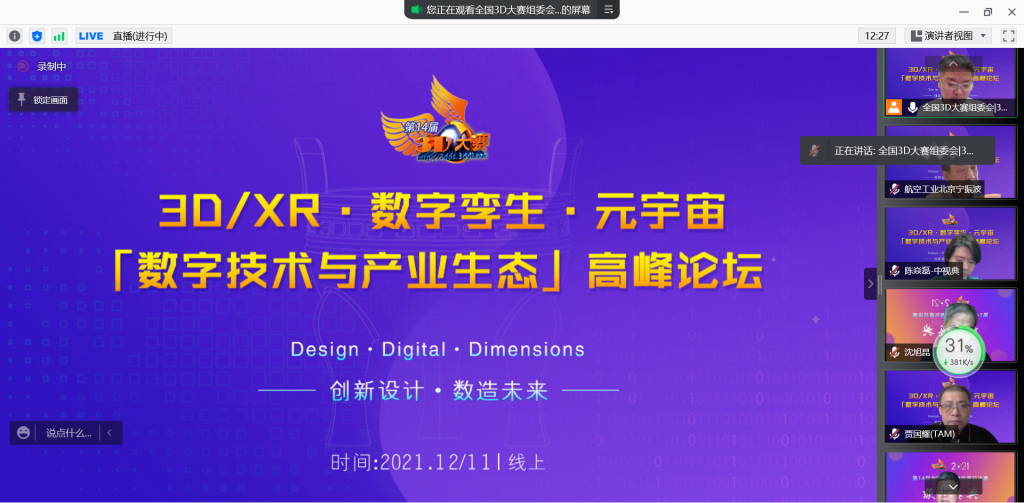 本次比赛除了三维数字化总决赛之外,主办方还组织了“3D/XR·数字孪生·元宇宙「数字技术与产业生态」高峰论坛圆桌论坛”。论坛邀请了全国3D大赛技术专家委员会轮值主席、中国航空工业集团信息技术中心原首席顾问、中国船舶独立董事、工信部首批两化融合专家宁振波,上海影创科技集团董事长兼CEO孙立、AMD营销副总裁纪朝晖,中视典数字科技CEO陈焱磊等一批大咖开坛讲座,向我们介绍了AMD设计师电脑助推元宇宙+教育创新发展、数字化技术在企业中的应用等内容,让我们在比赛之余还享受了一场知识革命的盛宴。