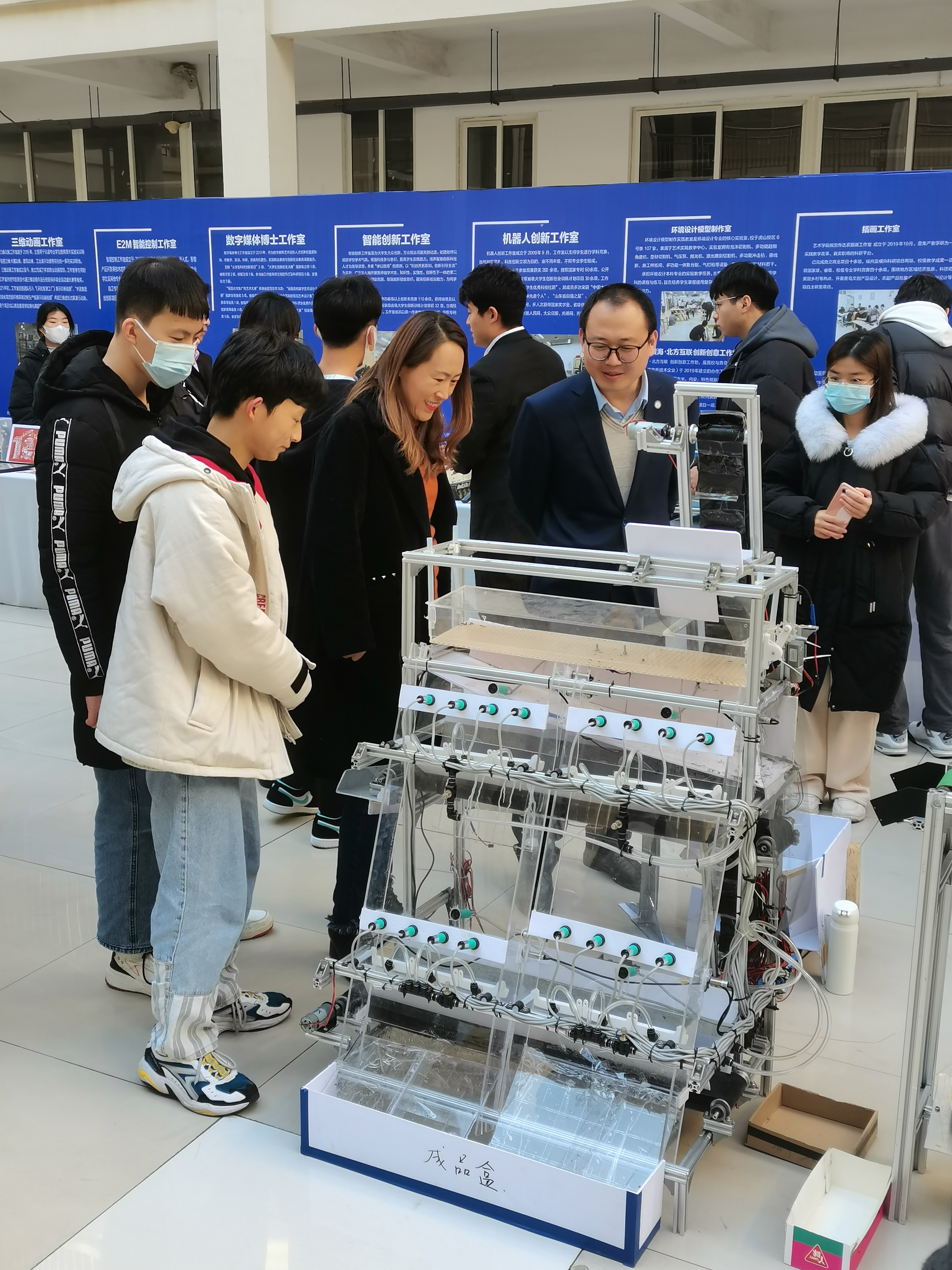 在本届大学生科技节上,我院展示的科技作品主要分技能竞赛和表演展示两大类。具体为擂台机器人、双足机器人、智能避障避险、三维设计、实物制作等作品,学生们认真熟练地向前来参观的领导和学生展示作品功能,受到了师生的一致好评。这些作品全部是在老师的精心指导下由学生独立完成,曾代表我校参加国家级、省级等各类科技竞赛,并在大赛中取得了优异成绩。学院领导非常重视学生创新能力的培养,近几年逐渐成立了机器人创新工作室、科技创新工作室、机电创新工作室等7个创新工作室,工作室实行全天候开放,为学生创新创业提供了有力的平台支持。2021年,我院学生参加各级大学生科技创新竞赛29项,共获奖530余项,其中国家级奖项51项,荣获优秀指导教师20余人次,培养了—大批创新人才,其中刘昱被评为“2021年度青岛西海岸新区最美大学生”、王大志获得2021年度“中国大学生自强之星”奖学金。