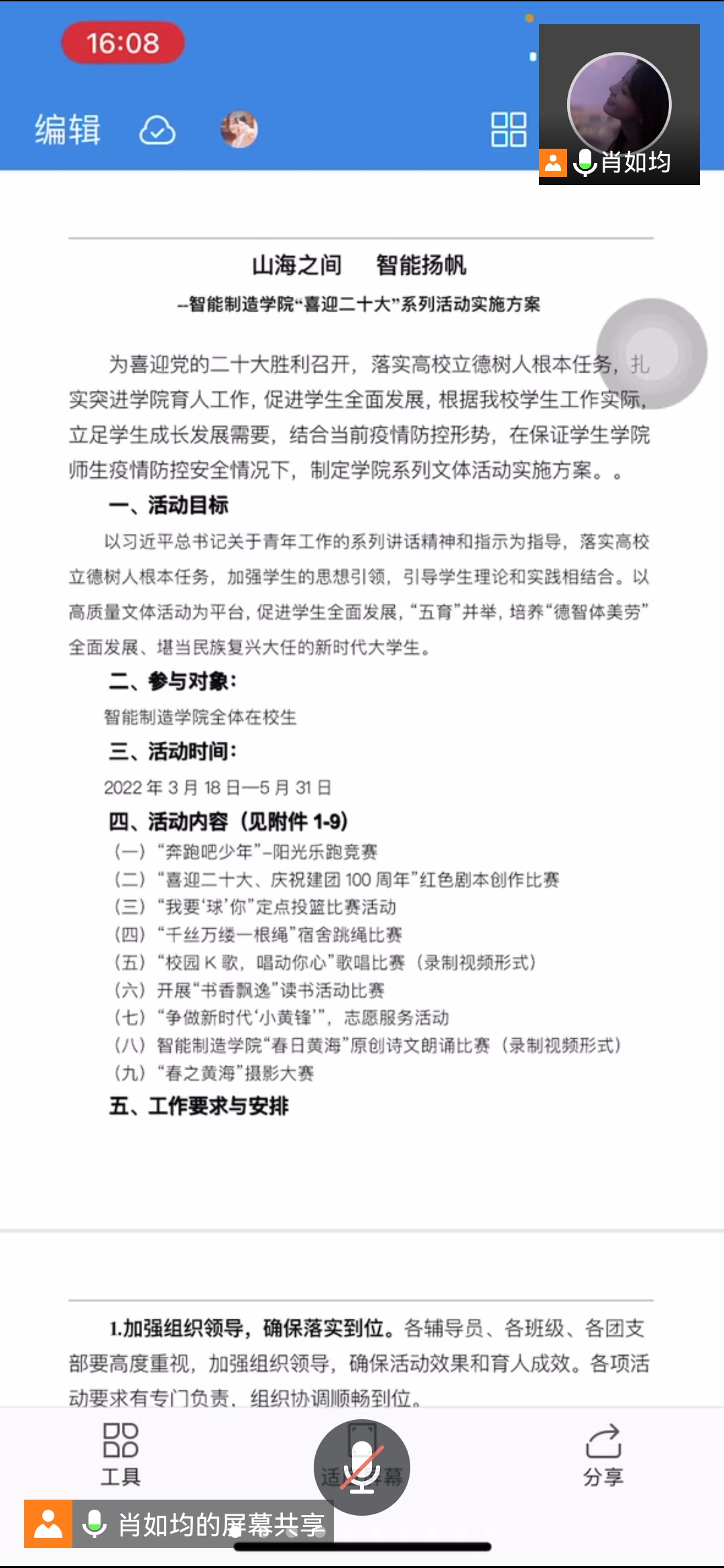 阳春三月,细雨和着微风,阳光伴着晨露。智能制造学院在统筹做好疫情防控的前提下,立足学生成长,不忘育人使命,聚焦“喜迎二十大”主题,于3月17日下午举行了智能制造学院系列活动线上启动仪式。学院院长助理刘润强,学工主任刘树龙、全体辅导员老师及各班级班长、团支书、学生代表参加了启动仪式。启动仪式由学院团总支书记赵绍利主持。