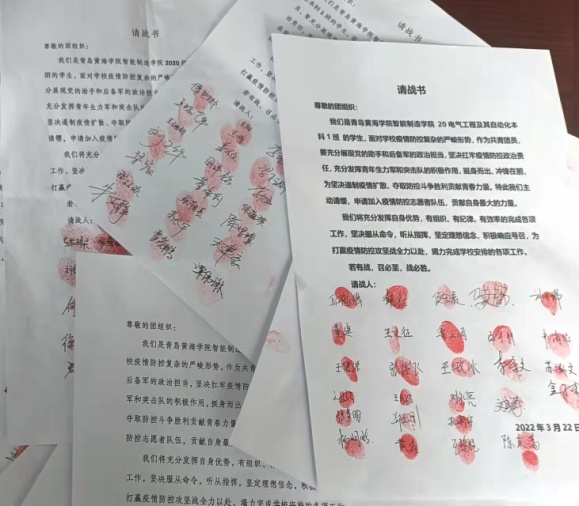 我们是青岛黄海学院智能制造学院的学生,面对学校疫情防控复杂的严峻形势,作为共青团员,要充分展现党的助手和后备军的政治担当,坚决扛牢疫情防控政治责任,充分发挥青年生力军和突击队的积极作用,挺身而出、冲锋在前,为坚决遏制疫情扩散、夺取防控斗争胜利贡献青春力量。特此我们主动请缨,申请加入疫情防控志愿者队伍,贡献自身最大的力量。